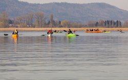Vorneweg Karin in grüner Paddeljacke immer in der Außenspur, den weitesten Weg suchend. Bequemere Paddler kürzten etwas ab. Jochen als Steuermann des Großschiffes war es wichtig, genügend Abstand zu den Einzelpaddlern zu haben, denn ähnlich der Titanic ist hier der Bremsweg recht lange.