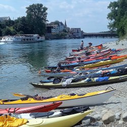 Für die Verbandsfahrt des Kanuverbands Baden-Württemberg waren an dem hochsommerlichen Juni-Wochenende rund 40 Kanutinnen und Kanuten aus Freiburg bis Ulm und Konstanz bis Wertheim zum Kanu Club Singen nach Iznang gekommen. Die vorgeschlagenen Touren auf dem Untersee und dem Rhein zwischen Bodensee und Schaffhausen waren sehr attraktiv. Nach der Begrüßung und der Vorstellung der möglichen Paddeltouren durch Andreas Mattes hatten sich schnell feste Gruppen zu zwei verschiedenen Fahrten für den Samstag verabredet. Eine kleinere Gruppe hatte sich als erste Tour die Umrundung der Insel Reichenau vorgenommen. Viele freuten sich aber auf die angebotene Tour vom Bootshaus des KCS über den Untersee und rheinabwärts bis zum Bootshaus des KC Schaffhausen. Dank des frühmorgendlichen Einsatzes von vier Freiwilligen wurden drei PKWs mit Bootsanhängern voraus nach Schaffhausen gebracht. So konnte die bunte Gruppe von über 20 Booten am Samstag zeitig um 9 Uhr zu ihrer 36 km weiten Tour ablegen. Vom Seekajak mit Grönlandpaddel über Wanderzweier bis zum Familienkanadier reichte die Bootsvielfalt am Start. Rund um das Naturschutzgebiet der Hornspitze der Halbinsel Höri ging es über glatte See und unter strahlend blauem Himmel vorbei an Gaienhofen Richtung Stein am Rhein. Nach der ersten Hälfte der Strecke auf stehendem Gewässer freuten sich alle ab Stein am Rhein über die muntere Strömung auf dem folgenden traumhaftschönen Flussabschnitt des Hochrheins. Gerade in den engeren Passagen zwischen den Waldhängen ist wegen den Begegnungen mit den Schiffen der Schifffahrtslinie Kreuzlingen – Schaffhausen Aufmerksamkeit gefordert. Zudem stehen immer wieder mächtige Pfähle zur Markierung der Fahrrinne in der Strömung. In der Strombiegung an der Bibermühle durfte man sich auch nicht von der Blasmusikkapelle ablenken lassen, die im Wasser stehend zum Ständchen aufspielte. Nach einer Pause am Rheinuferpark in Gailingen mit Blick auf Diessenhofen und seine imposante alte überdachte Rheinbrücke erreichte die Gruppe am Nachmittag das Bootshaus des KC Schaffhausen. Nachdem alle Boote verladen waren, ging es zurück nach Iznang. Die Gruppe, die mit dem ÖPNV zurückfuhr, nutzte dabei das Umsteigen in Radolfzell noch für einen ausgiebigen Test der hiesigen Eisdielen.